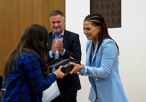 Wir gratulieren David Hagemeyer, Christian Knoll, Kristina Isleiwa und Sebastian Schiller zu ihren herausragenden Abschlüssen! Sie sind das beste Beispiel dafür, dass sich harte Arbeit und Engagement auszahlen. Als Ehrengast gratulierte ebenfalls die Frankfurter Boxweltmeisterin Bilgenur Aras alias „Puncherella 069“ und inspirierte mit Einblicken in ihre sportliche Karriere.