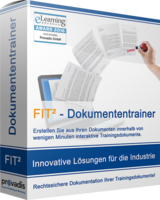 Mit dem FIT² Dokumententrainer können selbst Einsteigende problemlos in nur 15 Minuten ein Dokument in ein interaktives Training verwandeln. Dazu wird der zu schulende Inhalt als PDF-Dokument in das Tool eingeladen und dort automatisch „verfilmt“. Das Originaldokument bleibt erhalten und muss nicht erneut freigegeben werden.