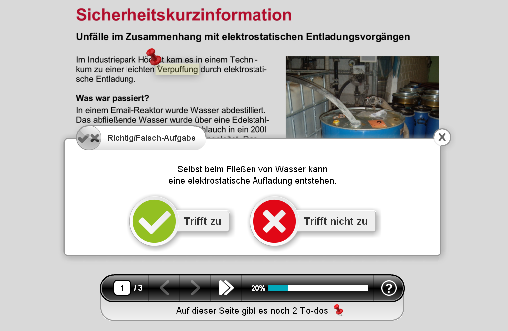 Auf die Oberfläche des Dokumentes können nun, wie auf eine zweite Ebene, Abdeckungen, zusätzliche Informationen oder Lückentexte angebracht, Aufgaben und viele weitere Interaktionen eingefügt werden. Eine optionale Lernerfolgskontrolle oder Lesebestätigung am Ende der Schulung gewährleistet die Rechtssicherheit.