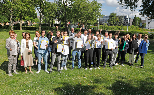 Das ausbildungsvorbereitende Programm der Chemiesozialpartner „StartPlus“, das von mehreren Unternehmen am Industriepark Höchst zusammen mit Provadis durchgeführt wird, wurde auch dieses Jahr wieder erfolgreich abgeschlossen. Zwölf der dreizehn Absolvent:innen starten im Herbst in eine Ausbildung. Provadis Geschäftsführer Dr. Udo Lemke und Ausbildungsleiterin Dr. Astrid Merz gratulieren zusammen mit den Vertreter:innen der Standortgesellschaften und den Ausbilder:innen allen Teilnehmer:innen und wünschten weiterhin viel Erfolg! Besonders freute alle Anwesenden, dass das Programm nun bereits seit 10 Jahren durchgeführt wird. So ermöglichte es zum einen viele erfolgreiche Einstiege junger Menschen in Chemieunternehmen und zum anderen bildet Start Plus einen wichtigen Beitrag zur Fachkräftesicherung.